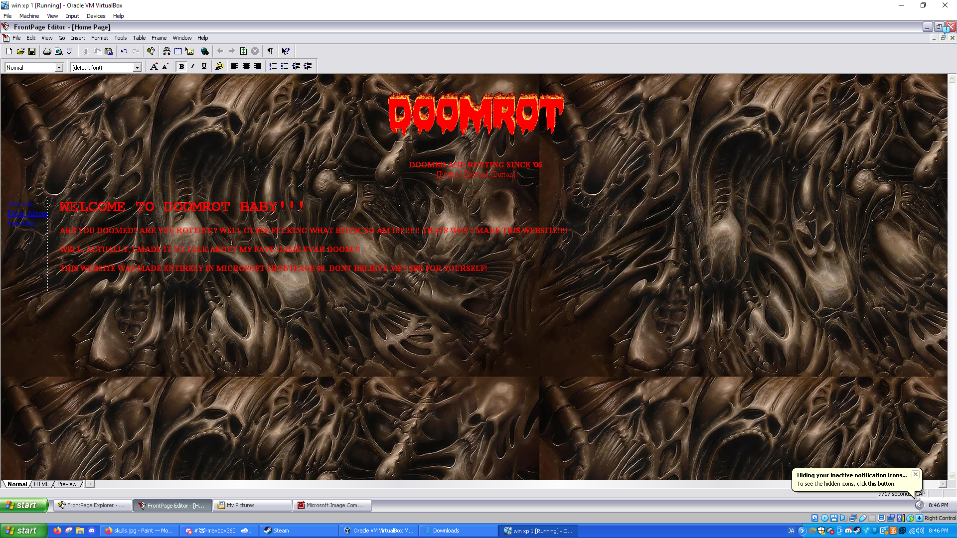 WELCOME TO DOOMROT BABY!!! ARE YOU DOOMED? ARE YOU ROTTING? WELL GUESS FUCKING WHAT BITCH, SO AM I!!!!!!!!!! THATS WHY I MADE THIS WEBSITE!!!! WELL, ACTUALLY, I MADE IT TO TALK ABOUT MY FAVE GAME EVAR DOOM!!! THIS WEBSITE WAS MADE ENTIRELY IN MICROSOFT FRONTPAGE 98. DONT BELIEVE ME? SEE FOR YOURSELF! WHAT AM I GONNA PUT HERE EXACTLY? I DONT KNOW. I DIDN'T GET THAT